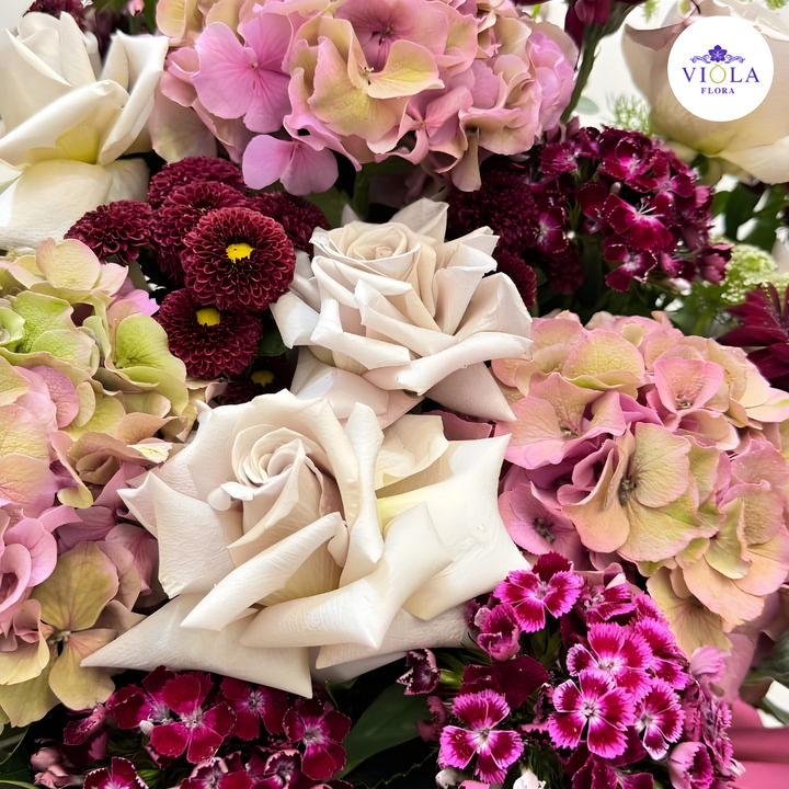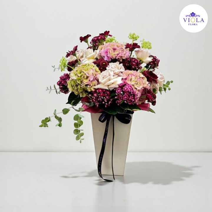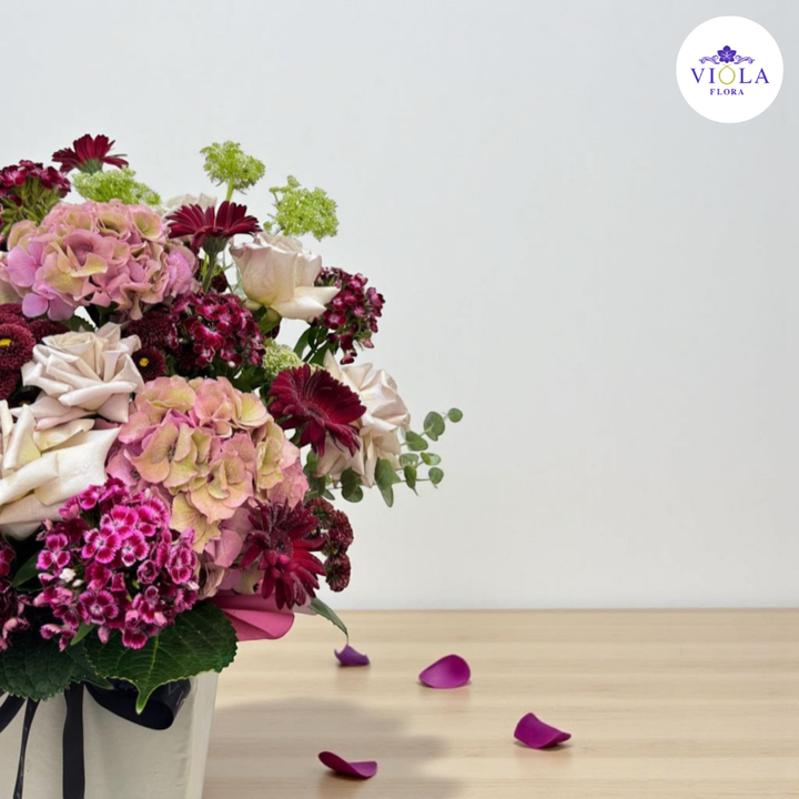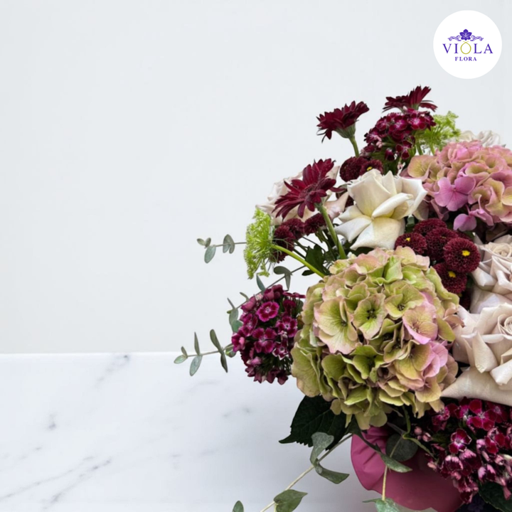 A rich and romantic mix of blush roses, deep burgundy blooms, and hydrangeas with lush greenery — perfectly arranged in a tall, modern vase and tied with a signature Viola ribbon. A timeless piece of beauty and grace. 💐💗✨
