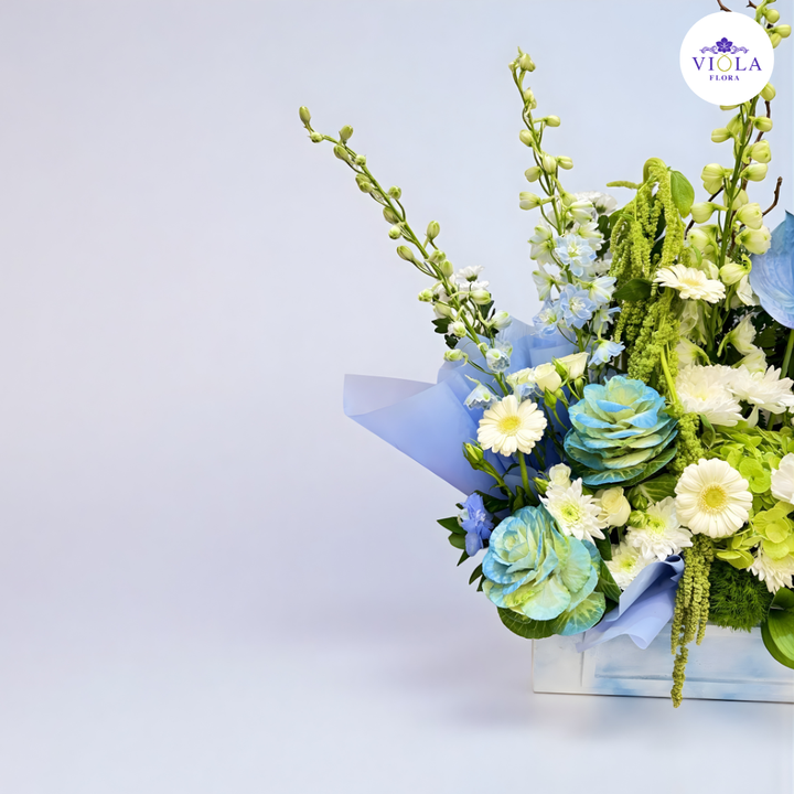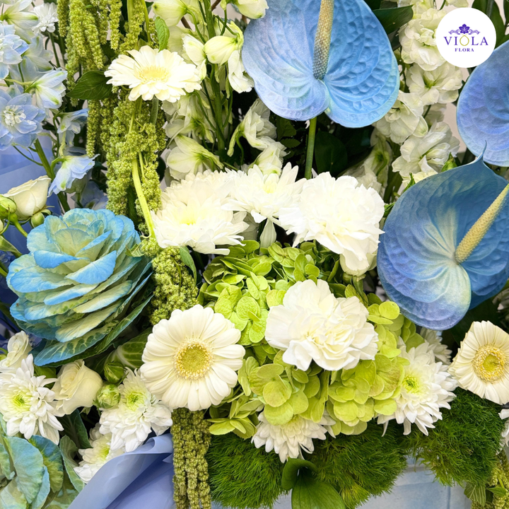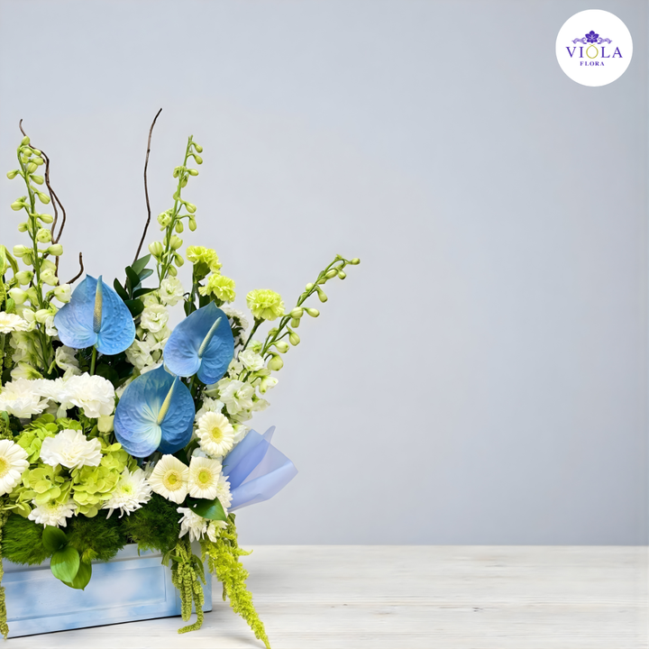 A calming blend of cool blue anthuriums, fresh white blooms, and soft green accents beautifully arranged in a modern box. This refreshing design captures peaceful elegance — perfect for celebrations, home décor, or thoughtful gifting. 💙🌿✨