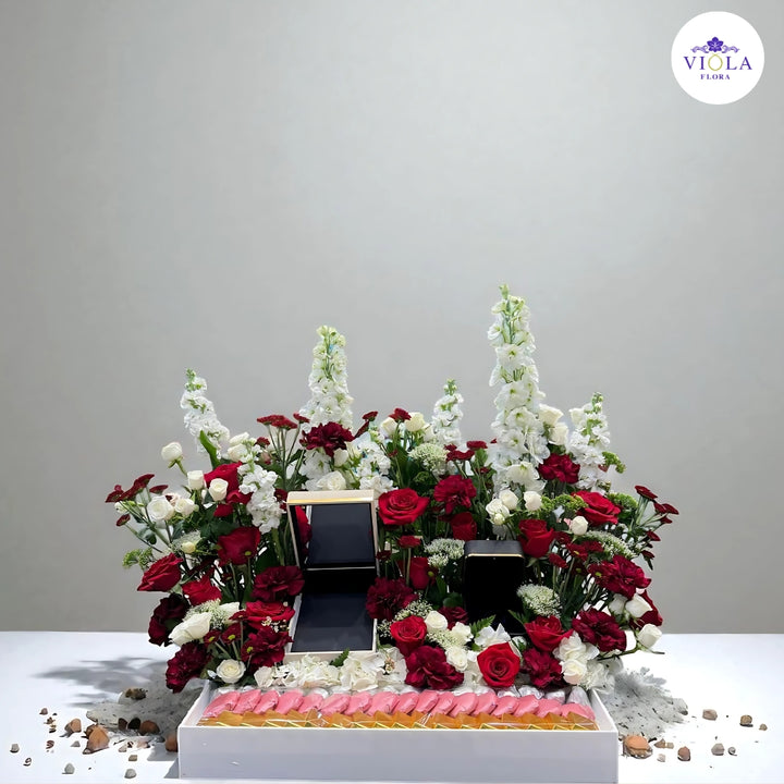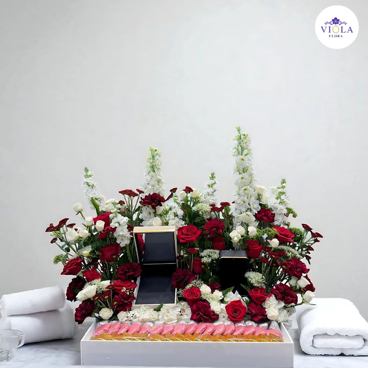 تنسيق زهور فاخر من أزهار حمراء داكنة وبيضاء نقية، مع مجموعة مختارة من الحلويات الفاخرة وصناديق الهدايا للاحتفال المثالي. 🎁🌹✨ طريقة رائعة للتعبير عن الحب أو الامتنان أو التهنئة بأناقة.