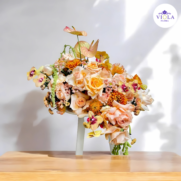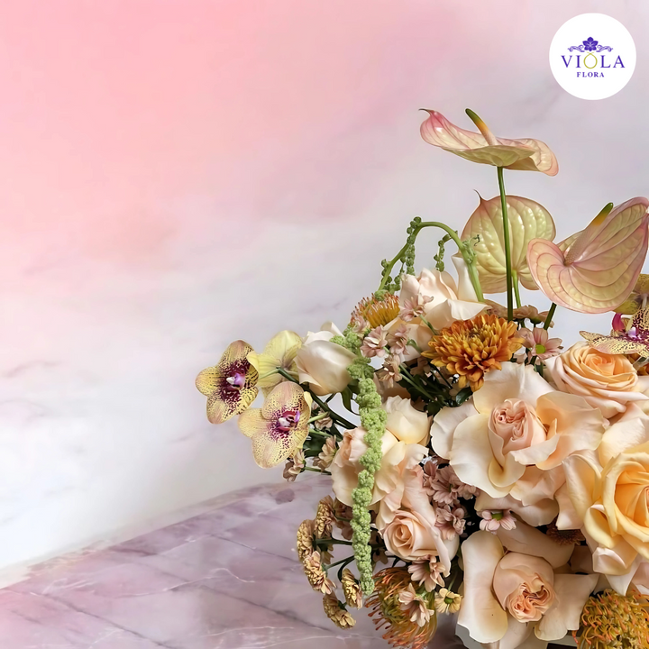 تصميم فاخر يضم ورودًا صفراء وخوخية متألقة، وأوركيد غريبة، وأنثوريوم مذهلة — عمل فني حقيقي من الزهور يشع بالرقي والسحر. مثالي للمناسبات الكبيرة واللحظات التي لا تُنسى. 🌹✨💛