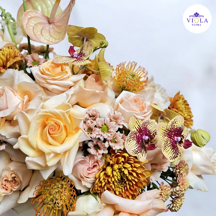 An opulent design featuring radiant yellow and peach roses, exotic orchids, and striking anthuriums — a true work of floral art that radiates sophistication and charm. Perfect for grand gestures and unforgettable moments. 🌹✨💛