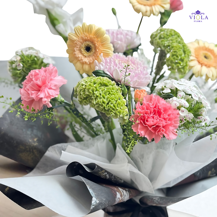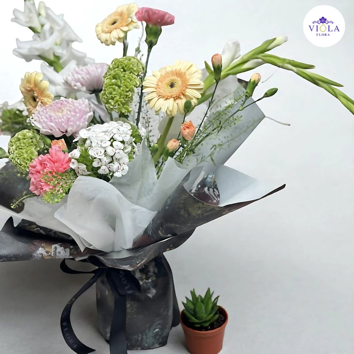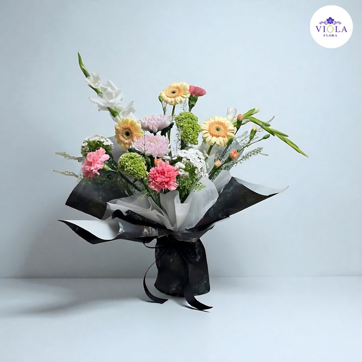 A delightful mix of soft pastels and fresh blooms, featuring gerberas, carnations, and seasonal flowers wrapped elegantly with a chic black bow. Perfect for brightening someone’s day with a touch of charm and freshness. 🌼💖